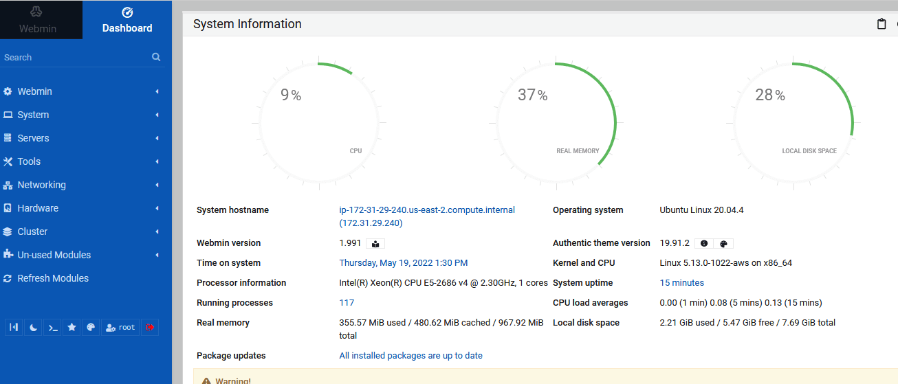 Once you enter the login details, you will see the Webmin dashboard's first page. It displays all the system information and packages that have updates available. Webmin will notify you to reboot immediately if any package updates are available.