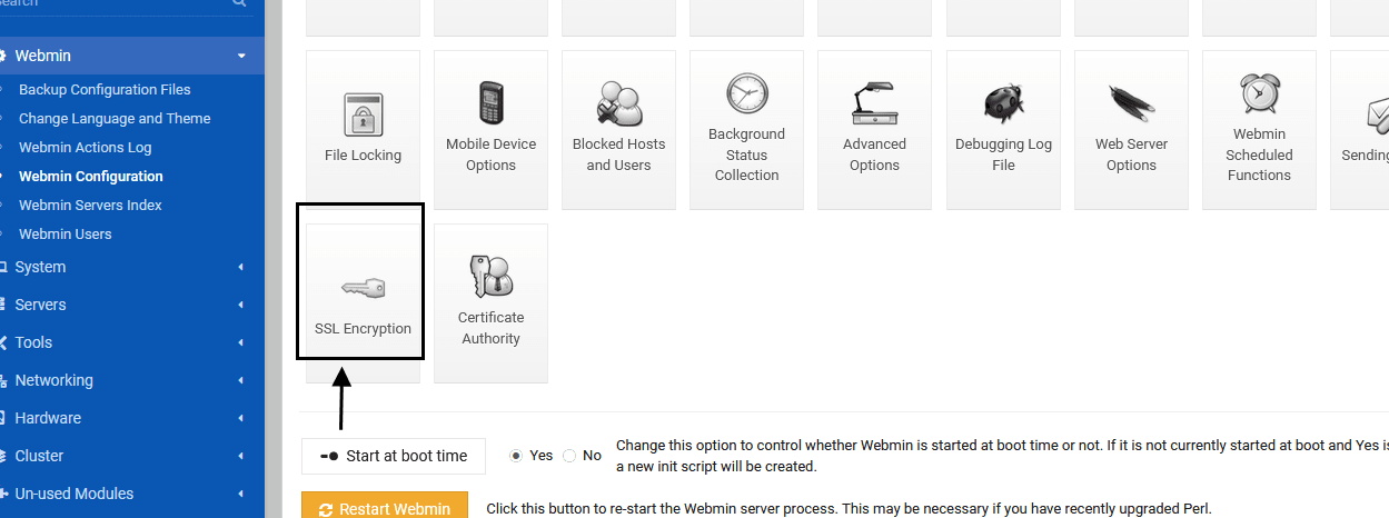 From the Webmin portal, on the left-side menu of the dashboard, select Webmin Configuration.
