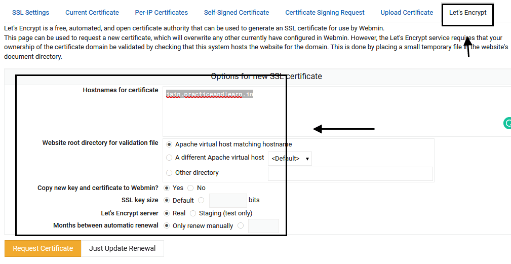 In the hostname field, enter your server hostname. Then, enter your website root directory in the Other directory field. The other fields can be left in the default setting. Click the RequestCertificate button to install the certificate.